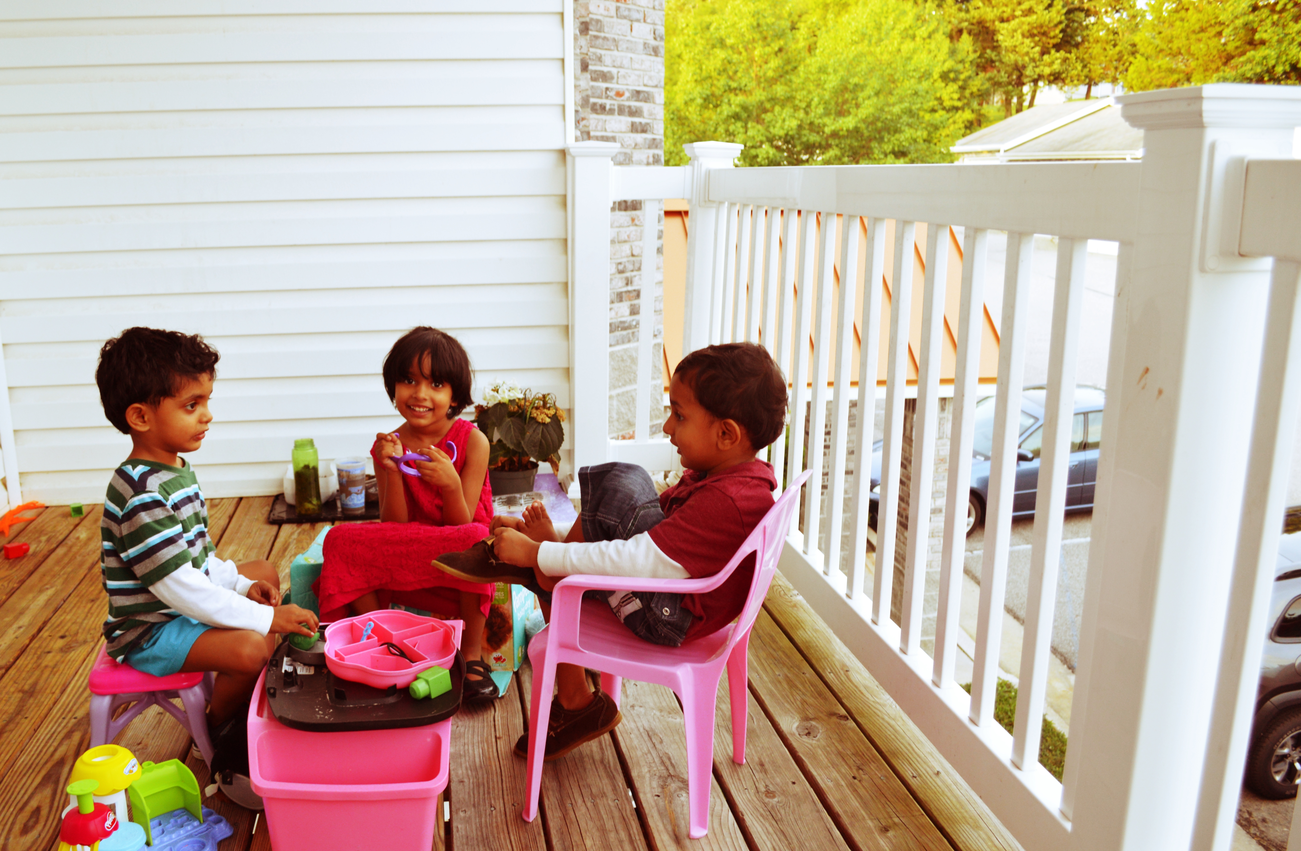 Tisha rushed to her play room to get a handkerchief, a crayon and water in her sippy cup.